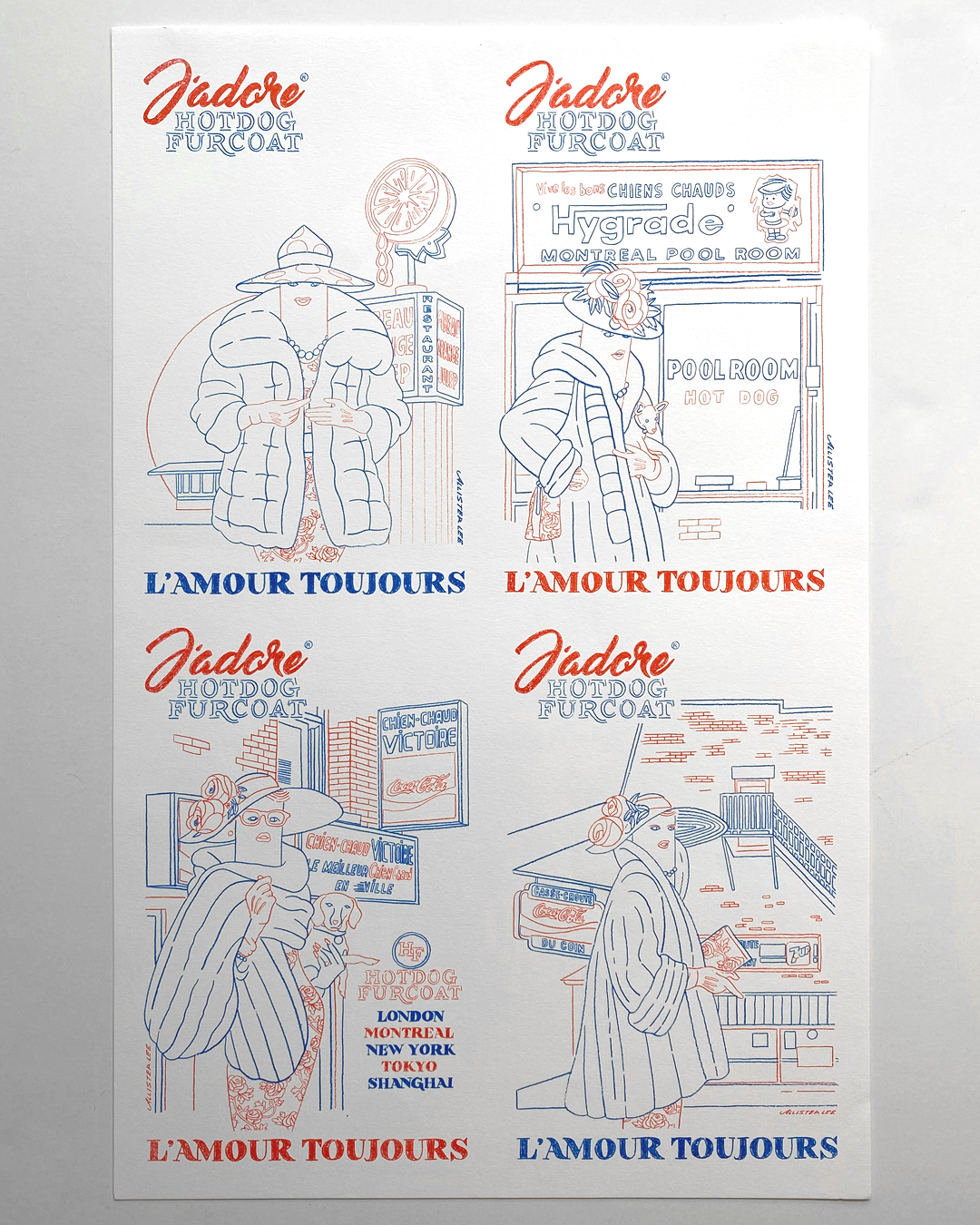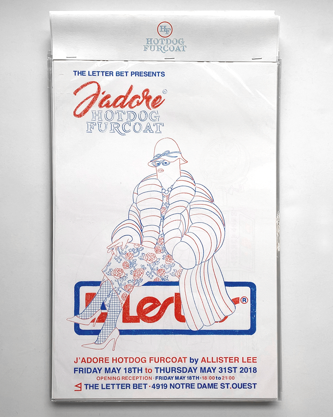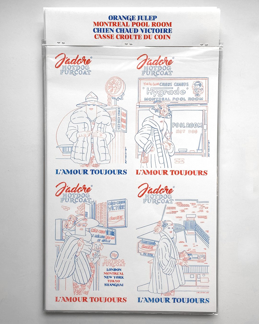 A sealed package of 4 risograph prints, 1 LetterBet Montreal exhibition poster print and 1 printed graphic checklist featuring Hotdog Furcoat against backdrops of select iconic Montreal Casse-Croute diner restaurants.