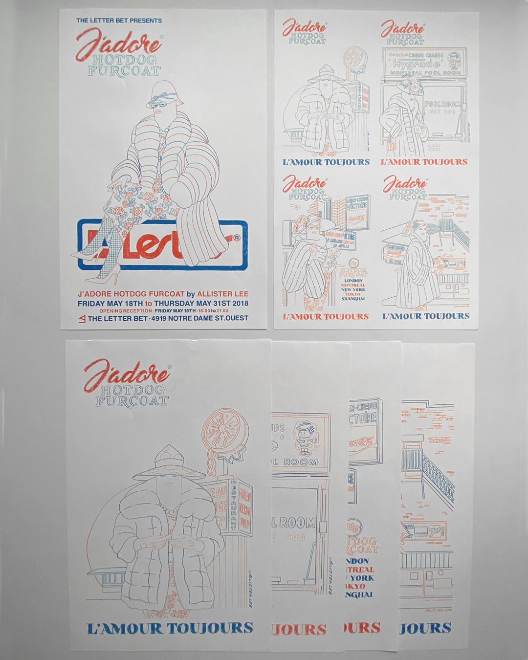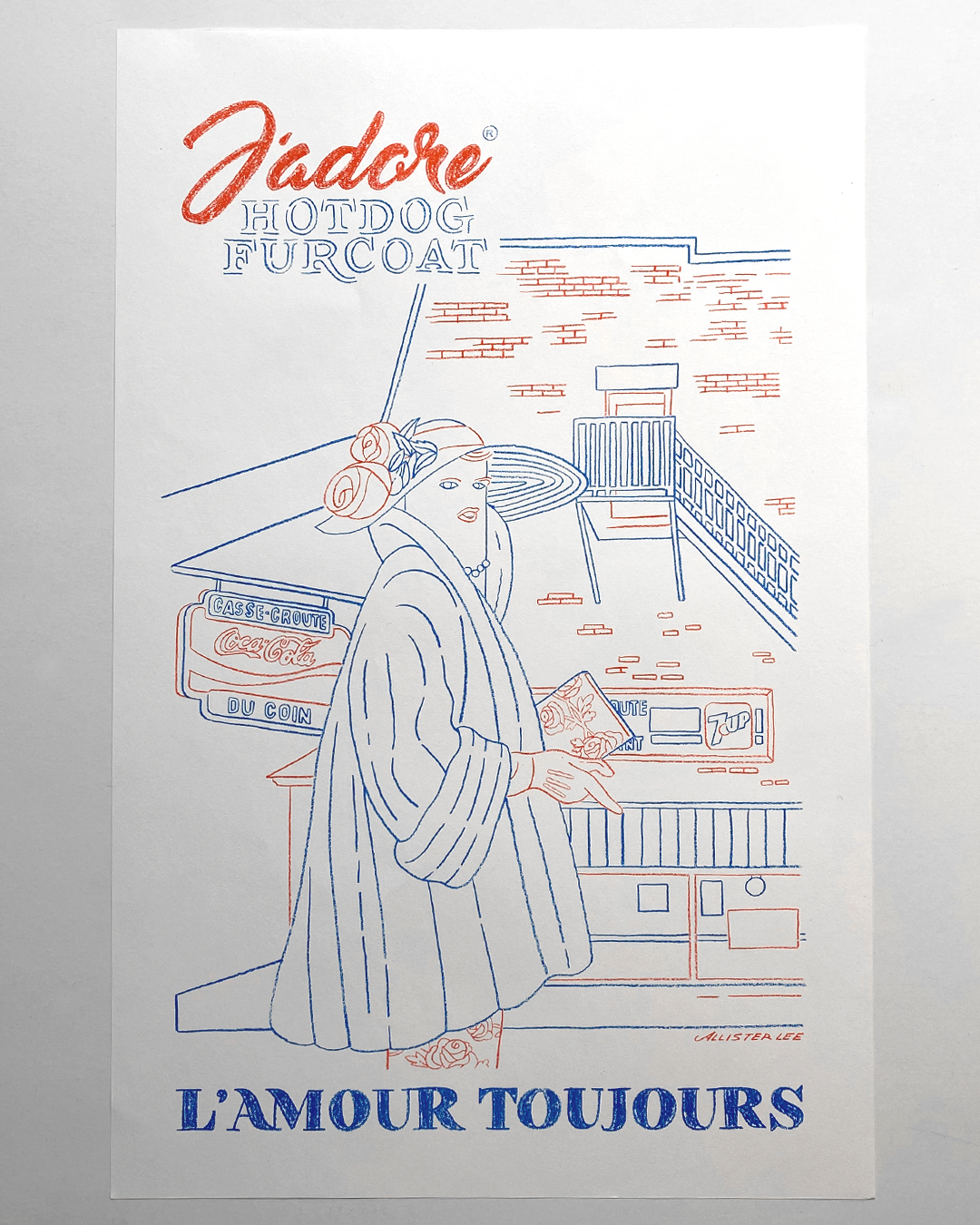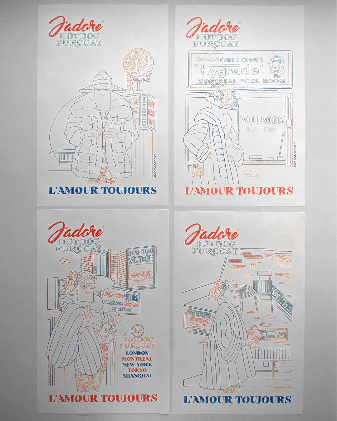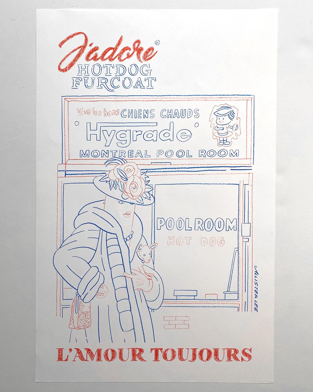– Poster prints feature Hotdog Furcoat in front of iconic Montreal Casse-Croutes – Orange Julep, Montreal Pool Room, Chien Chaud Victoire, Casse Croute du Coin