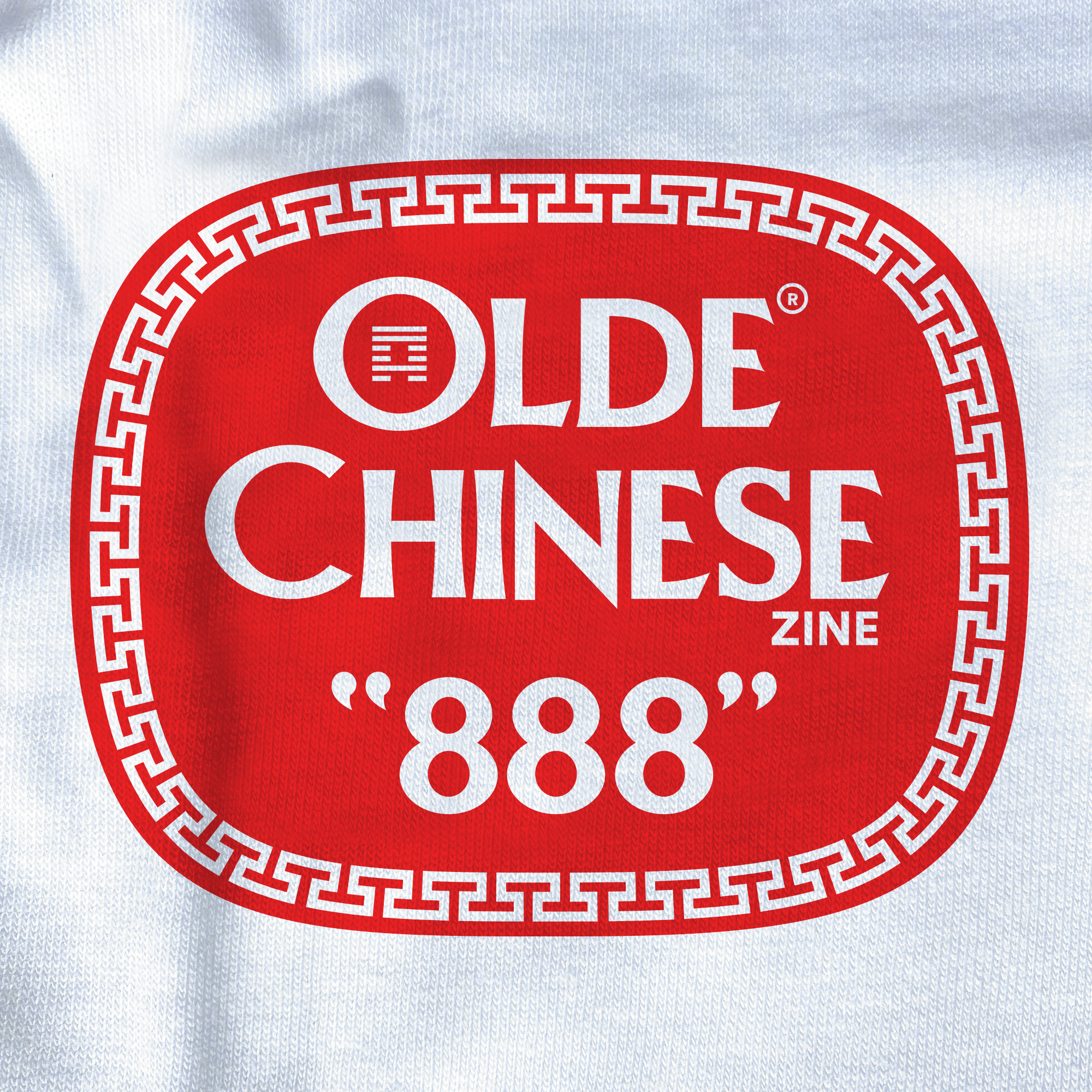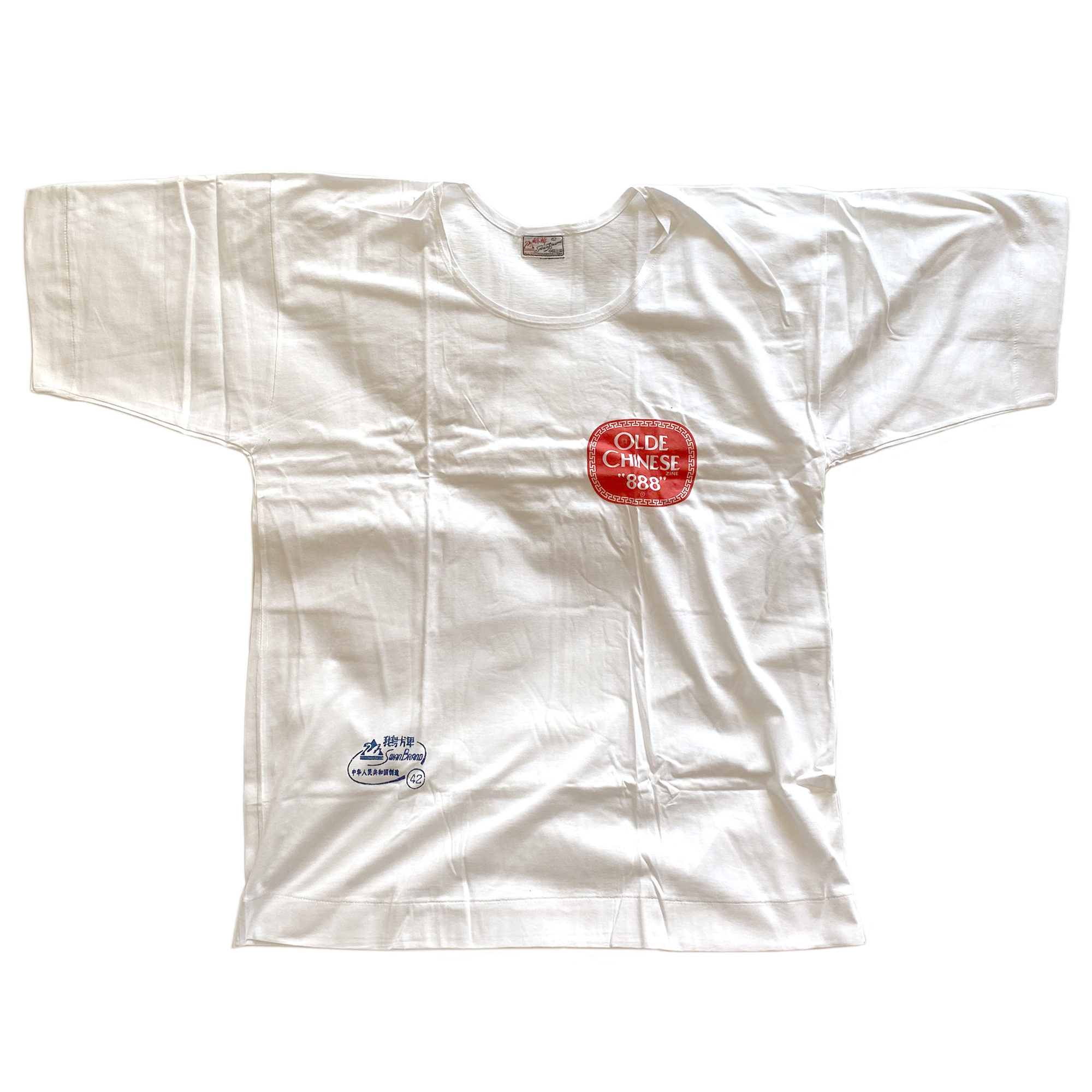 “New Olde Stock” white tee shirt featuring 1 color “OLDE CHINESE ZINE” chest logo on Swan Brand blank tee.