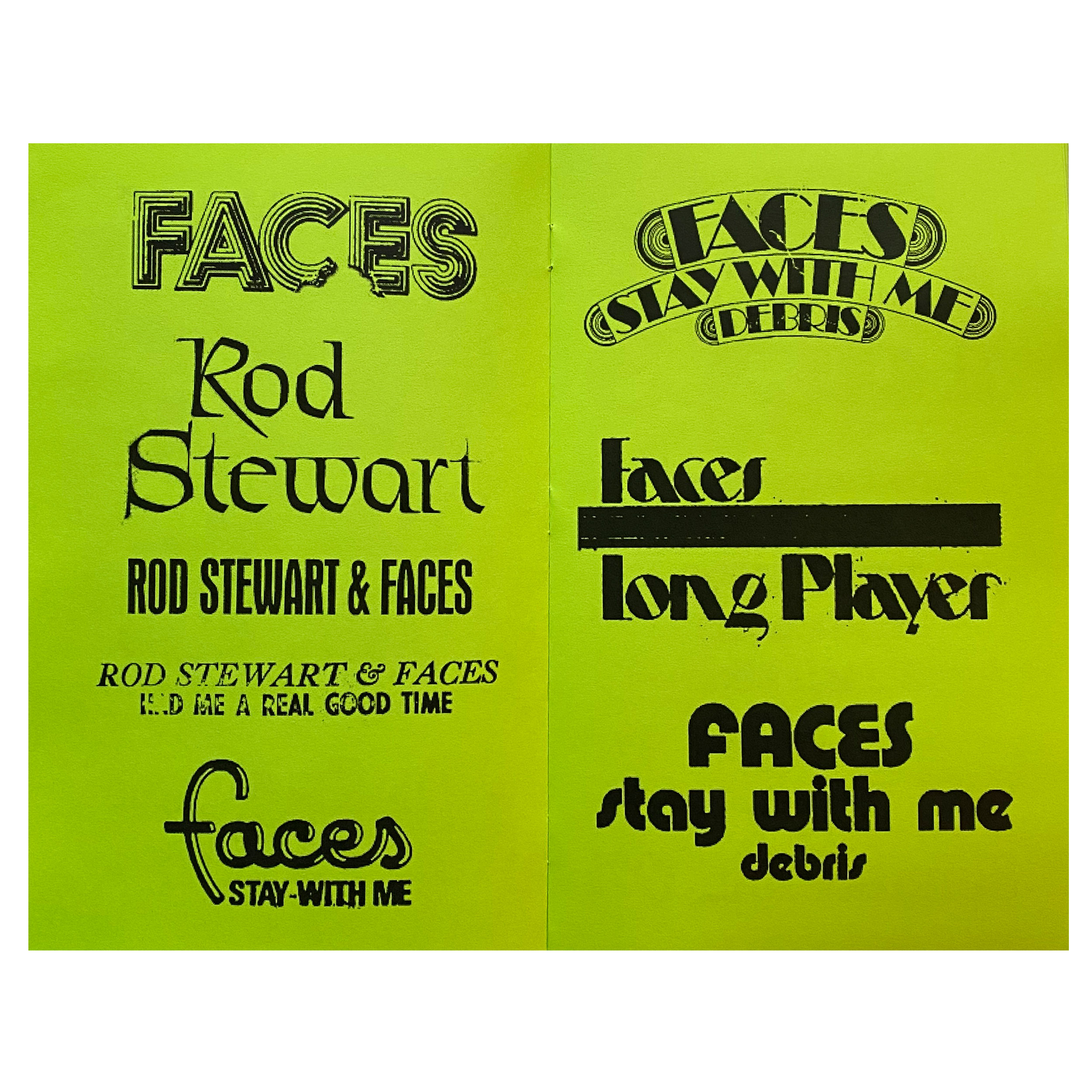 A compilation of font and typefaces used throughout album artwork, concert posters, ticket stubs and promotional print material.