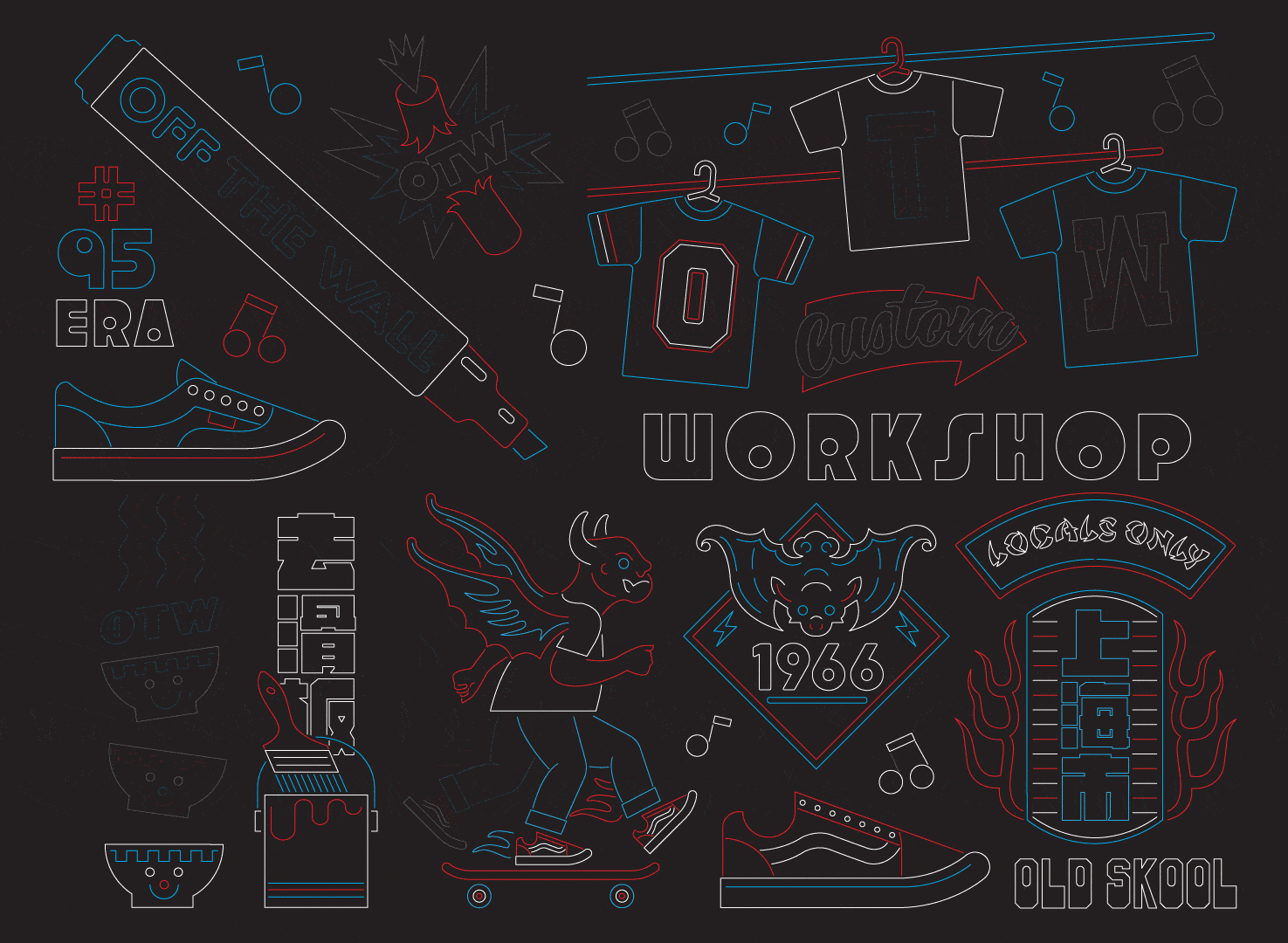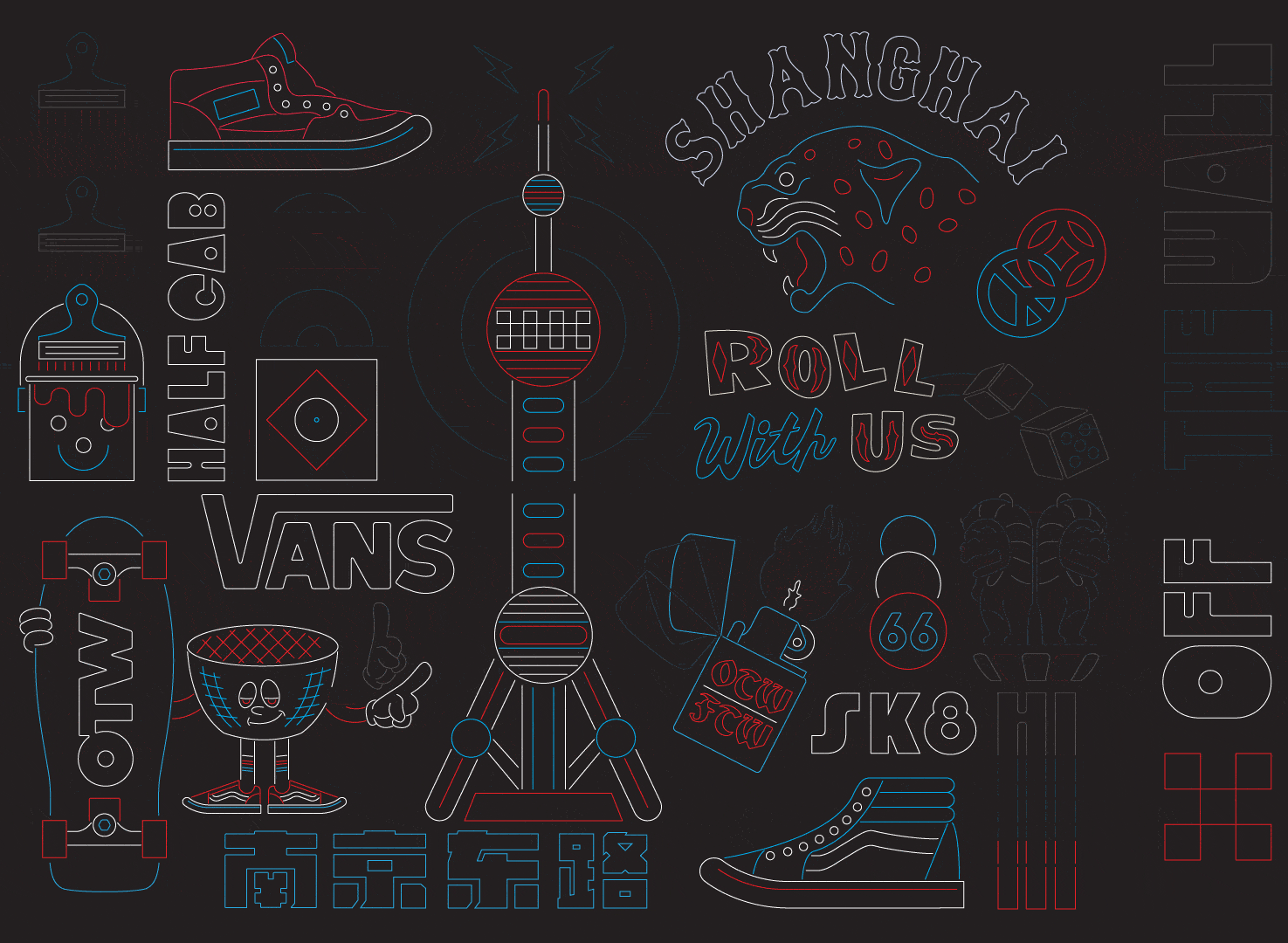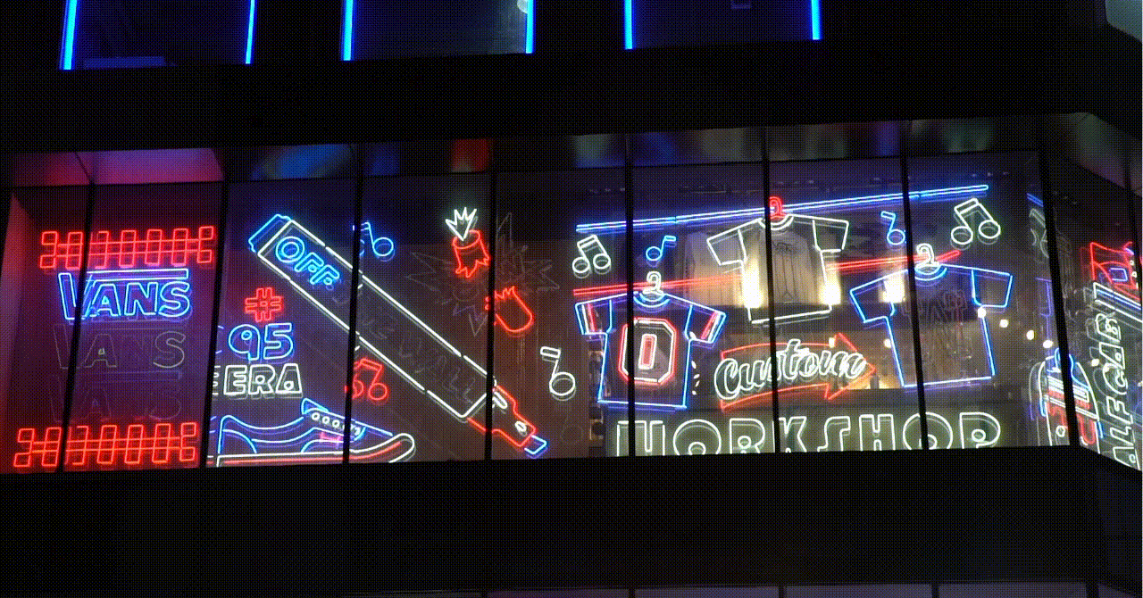 Animated 2-Floor wrap-around neon window installation for Vans Shanghai Flagship store at Nanjing Lu. Features a selection of Vans core product and slogans amongst icons and graphics that represent skateboard, creative and local culture.